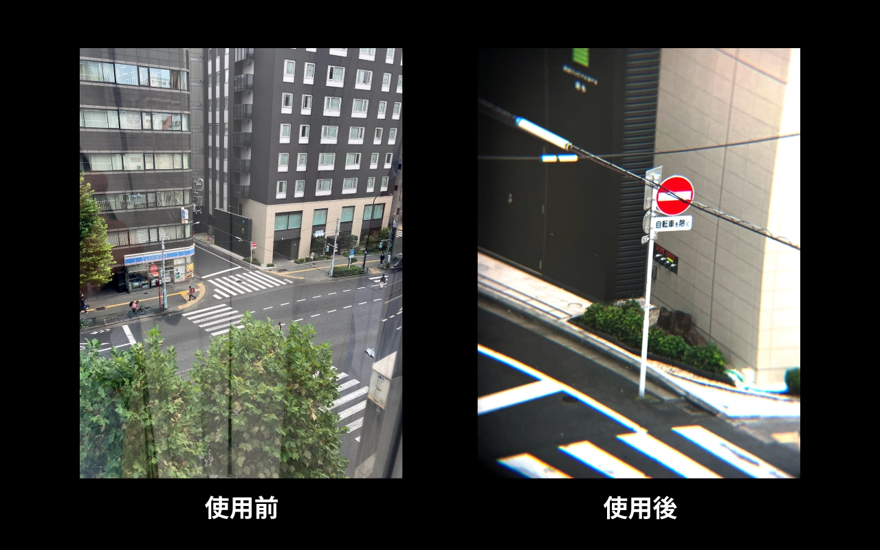 遠くにある小さな文字まで見えるので、付けていない状態で撮影した写真との違いがはっきりとわかるところは◎。それから、スマホに付けなくても望遠レンズだけとしても使える◯。ただ、防振機能が付いてないので、持ち手が疲れてきたらブレれるところは△。観賞・写真撮影用としてガンガン使いたくなるようなアイテムです。