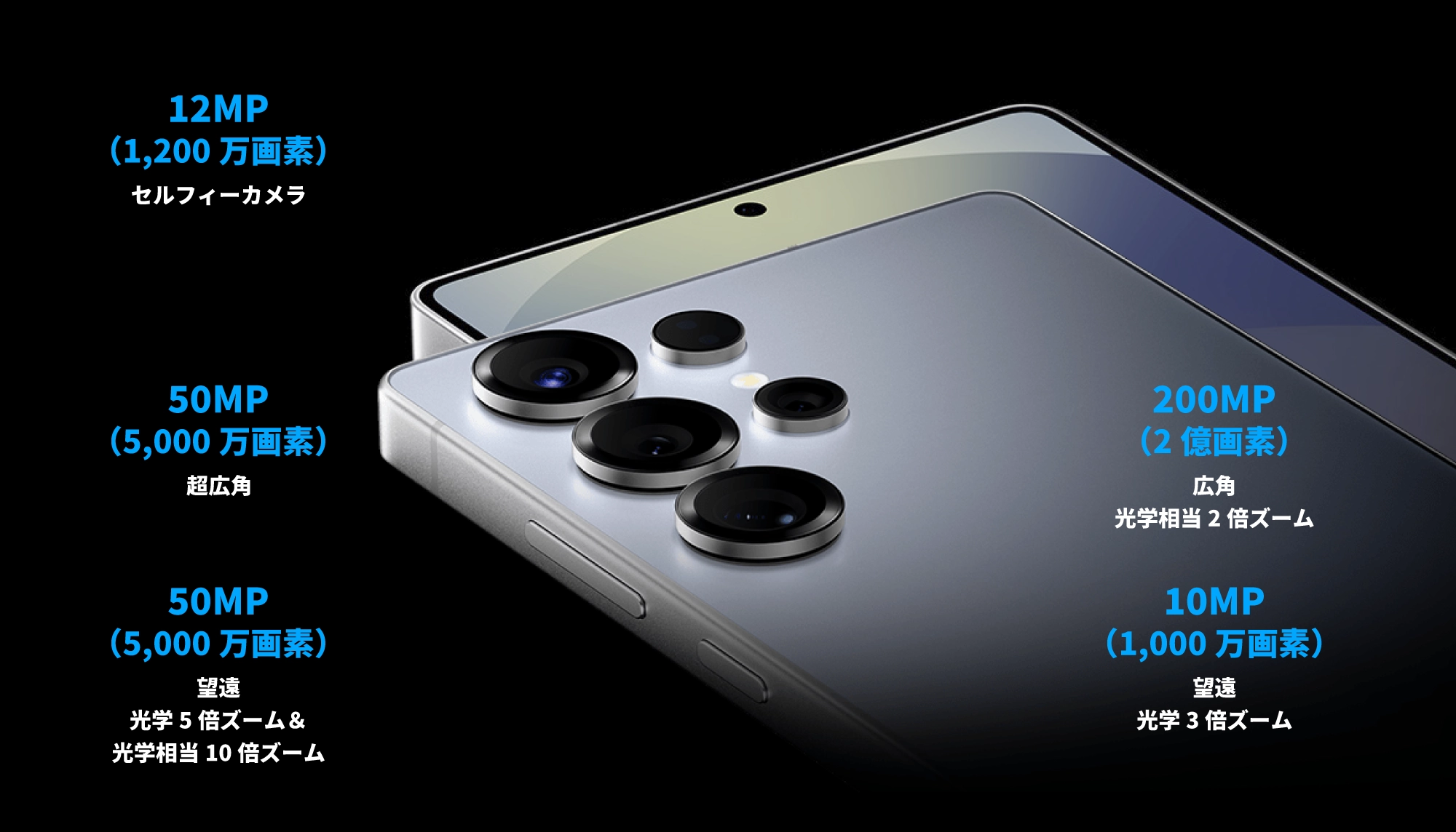 | メインカメラ | (超広角)約 5,000 万画素/(広角)約 2 億画素/(光学 5 倍望遠)約 5,000 万画素/(光学 3 倍望遠)約 1,000 万画素 |